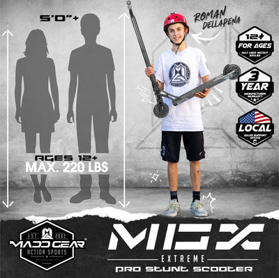 La trottinette MGX Extreme Complete Pro est le summum des trottinettes freestyle, considérez la barre haute à nouveau ! Le Madd Gear MGX Extreme est l'un des modèles les plus performants du marché et l'un des plus légers disponibles, avec seulement 7,49 lb.