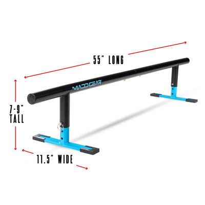 The Madd Gear Grind Rail is adjustable, starting low and allowing kids to learn to grind and improving their skills before taking it to the skate park on larger obstacles.