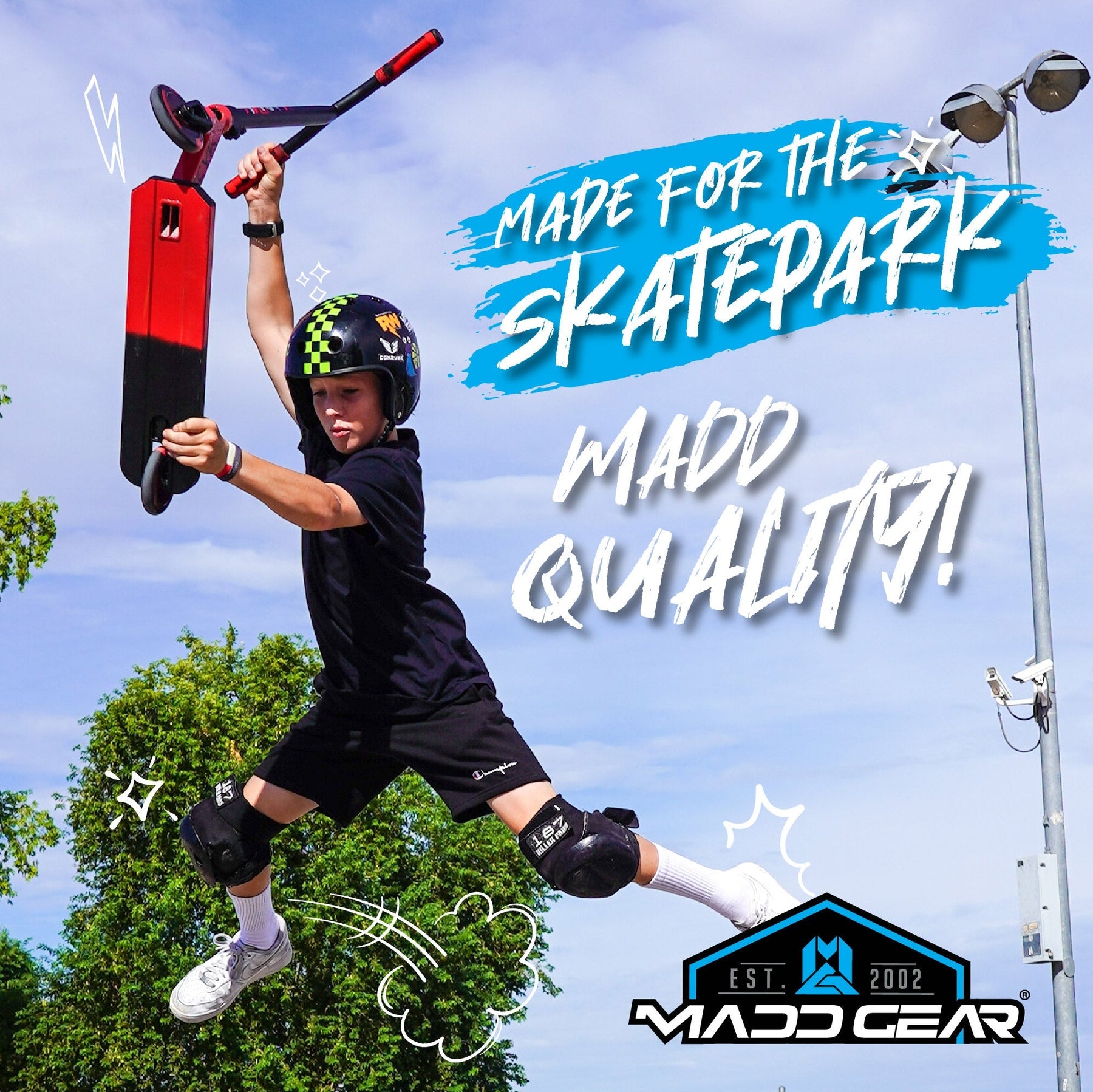 Alle Madd Gear Produkte werden von den besten Fahrern der Welt gründlich getestet! Mit über 20 Jahren Erfahrung in der Herstellung von Action-Sport-Ausrüstung, kannst du darauf vertrauen, dass Sie Qualität und Robustheit kaufen!