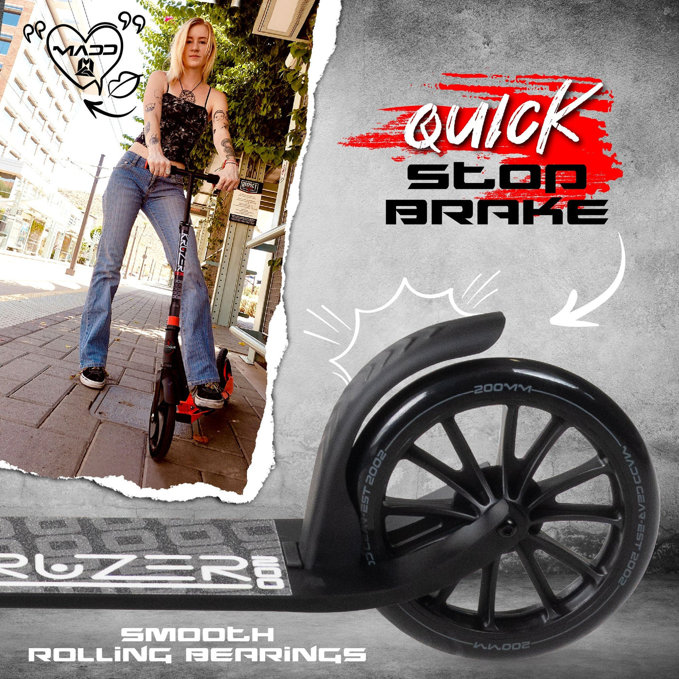 The Madd Gear Kruzer 200 Folding Scooter is the ultimate cruiser or commuter! With extra-large 200mm smooth rolling wheels for a comfortable ride and plenty of foot space you'll be rolling in style on your daily commute or just keeping up with the kids!