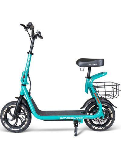 The Madd Gear Pendolare Electric Scooter combines practical design with comfort and convenience for riders aged 13 and up. Key features include an adjustable height, folding handlebar, and a storage basket. The scooter has a clear display for speed and battery levels, a padded seat, and ample foot space. Powered by a 350-watt motor and 48V battery, it reaches 18.5 mph with a range of up to 18 miles. It rides smoothly on 12” all-terrain pneumatic tires, with a rear disc brake for safety. Weighing just 44 lbs, it’s easy to maneuver and available in four colors. Supported by local aftersales in Arizona, the Pendolare is safe, fun, and designed in the USA.
