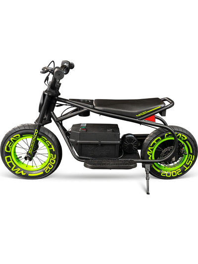 The Madd Gear Roadster 400 Electric Mini Bike is a stylish fat tire cruiser for riders aged 8 and up, supporting up to 165 lbs and ideal for heights between 3’6” and 5’4”. It features a dual speed switch, reaching speeds of up to 14 mph with a 10-mile range. Equipped with a maintenance-free brushless motor, 24V lead acid batteries, and the Madd Gear Battery Modular System, it ensures extended ride times and easy battery swaps. The minibike has 12” pneumatic tires, a powerful disc brake, and a working taillight. Weighing 43.5 lbs., it's compact and easy to manage.